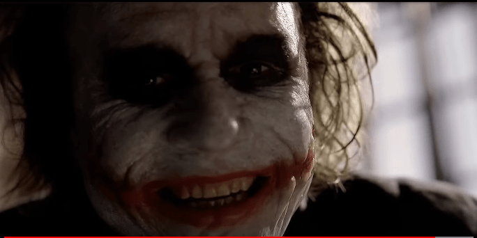 The close up of The Joker, with the violins in the background going form a higher note to a lower one that is a sinister impression of him, the audience already know what he is capable of due to the build up from the beginning. The camera is positioned in a low angle , not only to demonstrate POV shot of his victim, but also demonstrate his power he has over him.