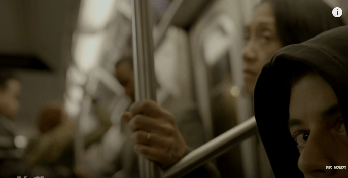 After he finishes his speech, it turns black back again until the sound of a train stopping comes as Elliot is with his hood up looking at two guys suits. He seems nervous and sort of out of place, like he doesn’t want to be there. The camera shots in the show are unconventional, they don’t follow the normal “rules” of camera shots. As shown in the image above, Elliot is in the corner of the frame instead of being front and center. This is the first time Elliot is shown, this is the first look the audience sees of him. The camera placement connotes to his shyness and discomfort of being in a public place to the audience.