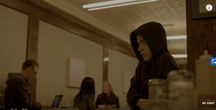 He reveals how he is control in the situation due to him having all the evidence of Ron’s illegal website. A robotic sort of sounds starts going as the conversation becomes more interesting, it helps build the tense and mysterious atmosphere of the scene. Then he reveals he is -despite what he knows about Ron- he is still empathetic; he says that he understands what is like to be different because he is very different, too. And then the scene cuts. This leaves audiences with so many questions about who is Elliot, why was he still so anxious to talk to someone if he was the one in control of the situation. The show is sort of establishing an anti-hero rather than a hero, a more relatable character that audiences would appreciate more, which also lead viewers engaged in the show.